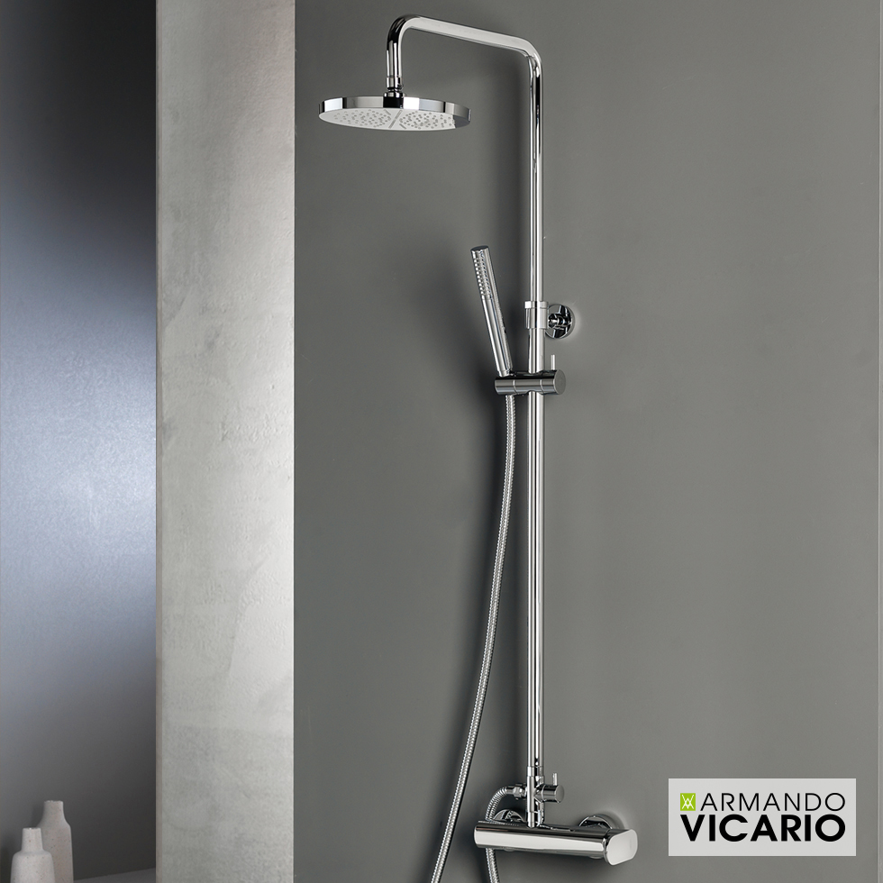 Μπαταρία ντουζιέρας θερμομικτική SLIM 2 εξόδων με κολώνα Φ20/25 mm ρυθμιζόμενου ύψους 83-144 cm, ανακλινόμενη κεφαλή Φ20 cm & τηλέφωνο Anticalcare με άθραυστο σπιράλ 1.5m, VICARIO Ιταλίας
