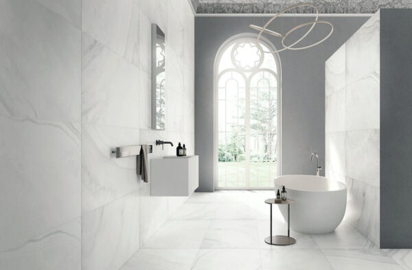 Γρανιτοπλακάκι διαστάσεων 60X120 γυαλιστερό όνυχας σε ήπιουσ τόνους με νερά λευκά και γκρι και του ιταλικού οίκου GAZZINI.