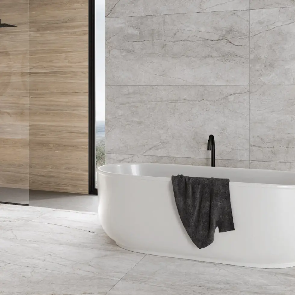 Γρανιτοπλακάκι 60X120 , με όψη φυσικού μαρμάρου σε λευκό-μπεζ απόχρωση , διακοσμημένο με διακριτικά νερά σε γήινουσ και χάλκινους τόνους. Ιδιαίτερη κοπή με λέιζερ, του ισπανικού οίκου KERATILE .