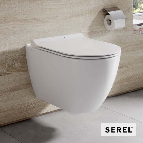 Λεκάνη SMART 56 RIMLESS χωρίς εσωτερικό χείλος για εύκολο καθάρισμα κρεμαστή με προβολής 52εκ., και αποσπώμενο κάλυμμα βακελίτη Slim soft-close, SEREL.