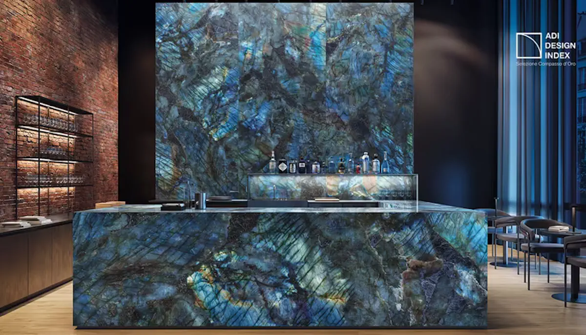 Γρανιτοπλακάκι 120X278 cm, με γυαλιστερή επιφάνεια που παραπέμπει σε βαθύ μπλε, πετρόλ μάρμαρο όνυχα , ιδιαίτερη κοπή με λέιζερ, του ιταλικού οίκου EMIL CERAMICA.